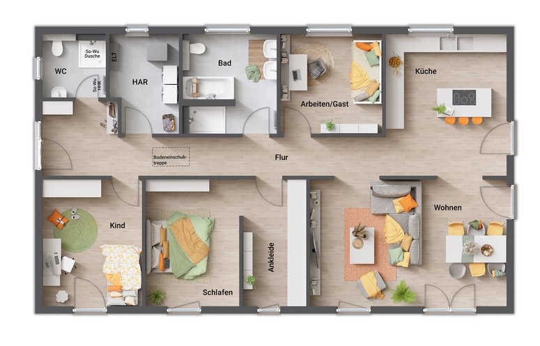 Der Bungalow 100 überzeugt mit rund 100 m² Wohnfläche, stufenlosem Komfort und flexibler Raumaufteilung – ideal für Familien und Paare. Lichtdurchflutet, modern und funktional. Jetzt anfragen und Wohntraum starten!