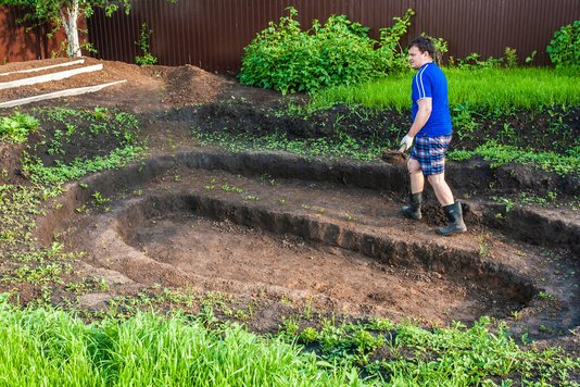 • Erde entsprechend der Schalenform ausheben, dabei ca. 10 cm mehr Erde ausheben, als für Teichschale notwendig